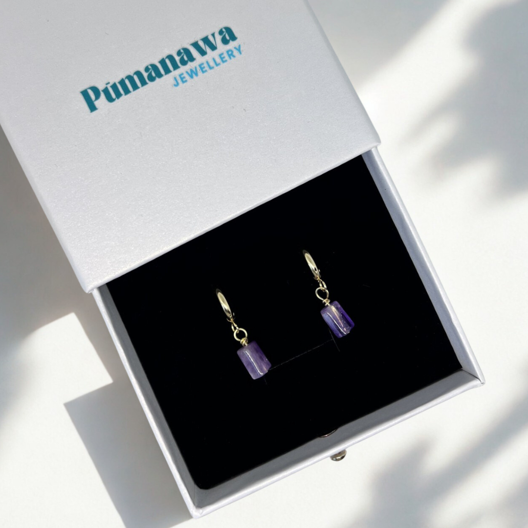 Tū- The Tū earrings are designed to sit with the wearer, steady and assured. Featuring amethyst, a stone associated with calm, clarity, and protection, they support balance and inner steadiness throughout the day. Strong in form yet effortless to wear, these earrings offer grounding without weight. Each amethyst is chosen with care to align with the wairua of Pūmanawa Jewellery and the integrity of our designs. Hand finished with attention to form and comfort, the Tū earrings reflect inner resilience and refined simplicity.